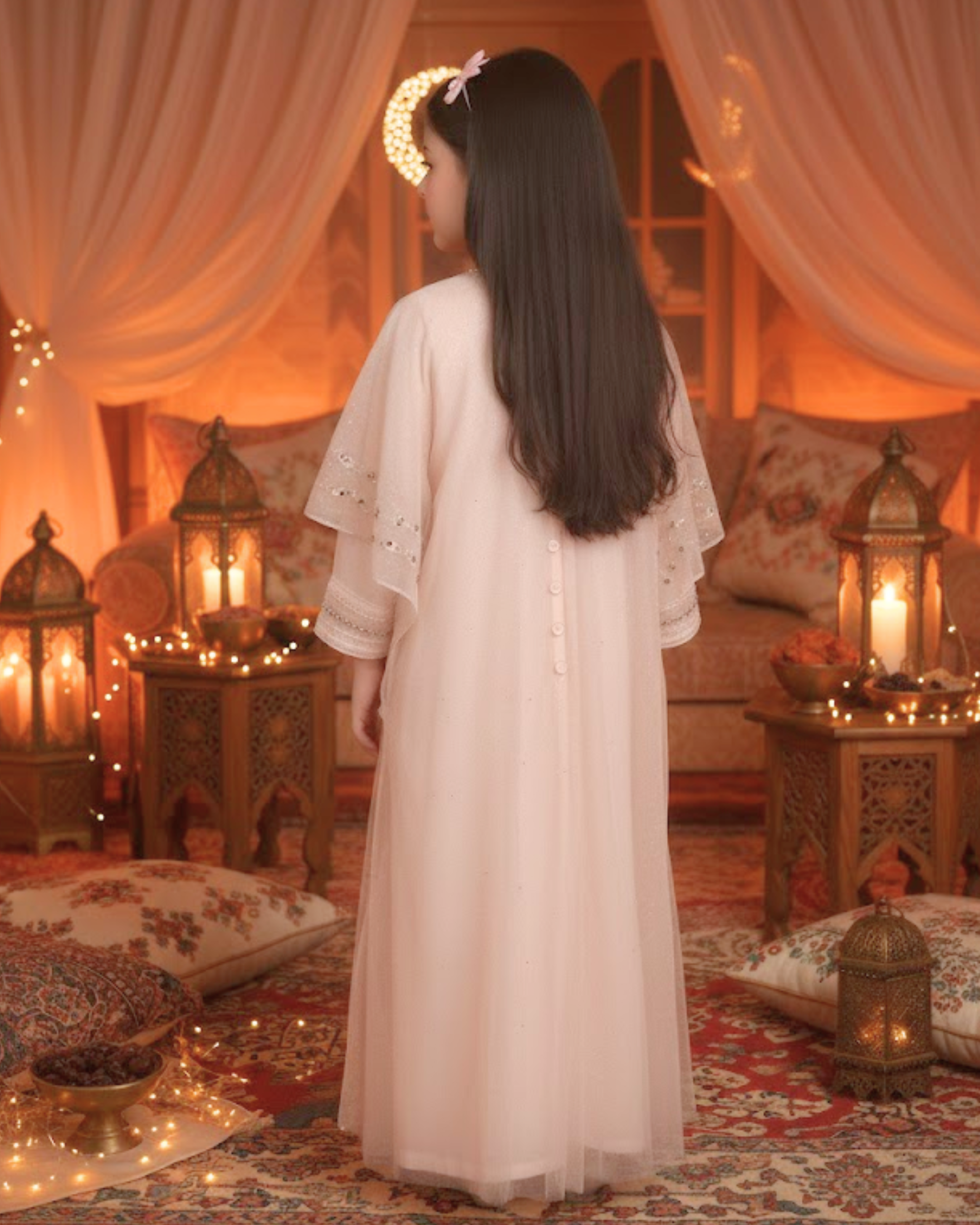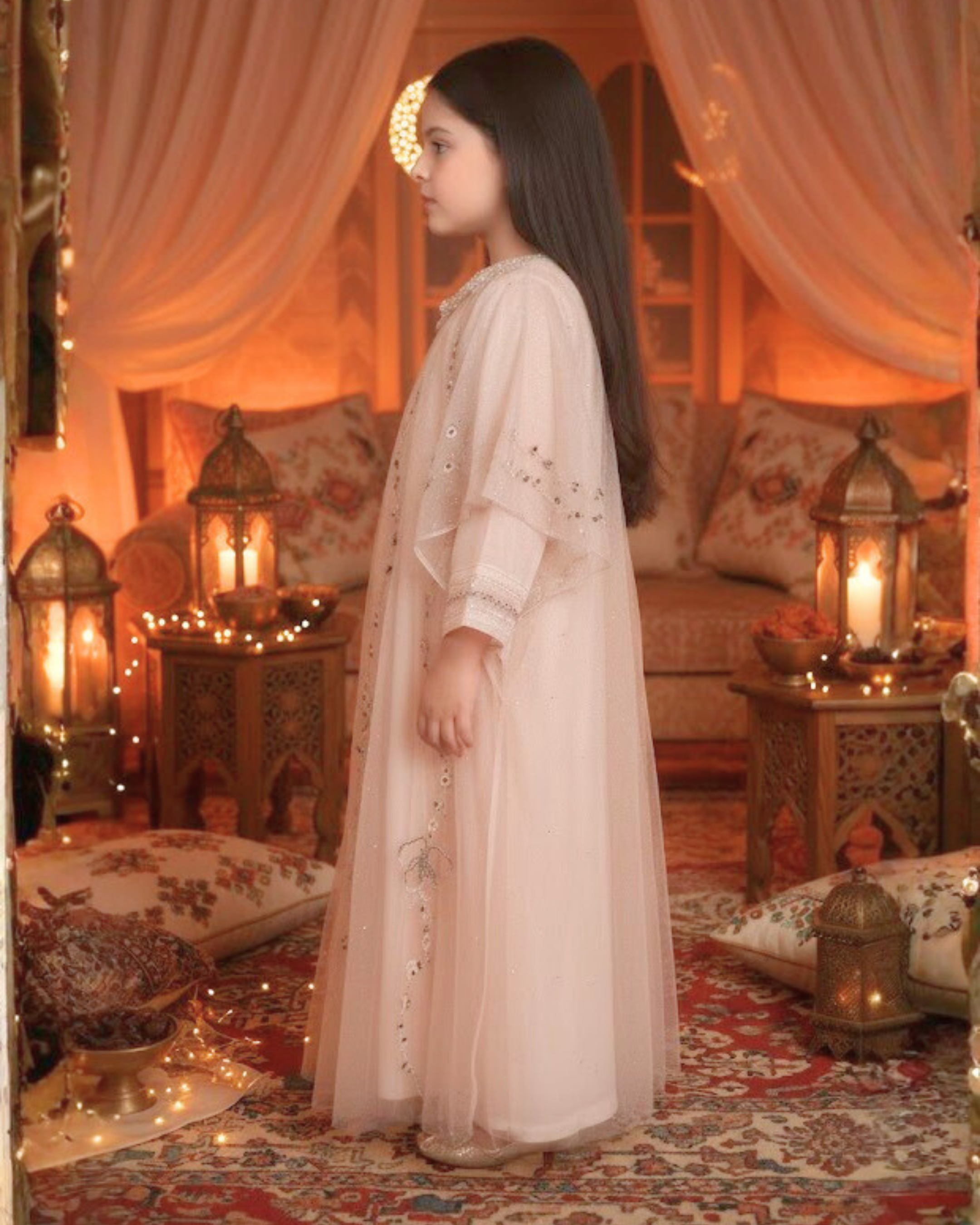 Embrace the spirit of the season with a piece defined by grace and light. The Moonlit Garden Thobe is a masterclass in delicate craftsmanship, designed for the girl who carries elegance wherever she goes.