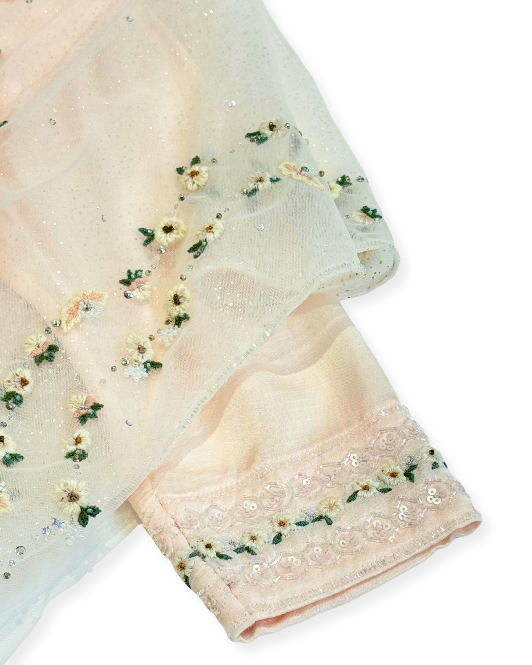 Crafted from layers of whisper-soft tulle in a sophisticated apricot hue, this enchanting gown features hand-applied floral embroidery that cascades like falling petals. The silhouette is defined by angelic flutter sleeves and a majestic neckline adorned with intricate 3D blooms and shimmering beadwork, offering a touch of celestial sparkle for your most special Ramadan gatherings.