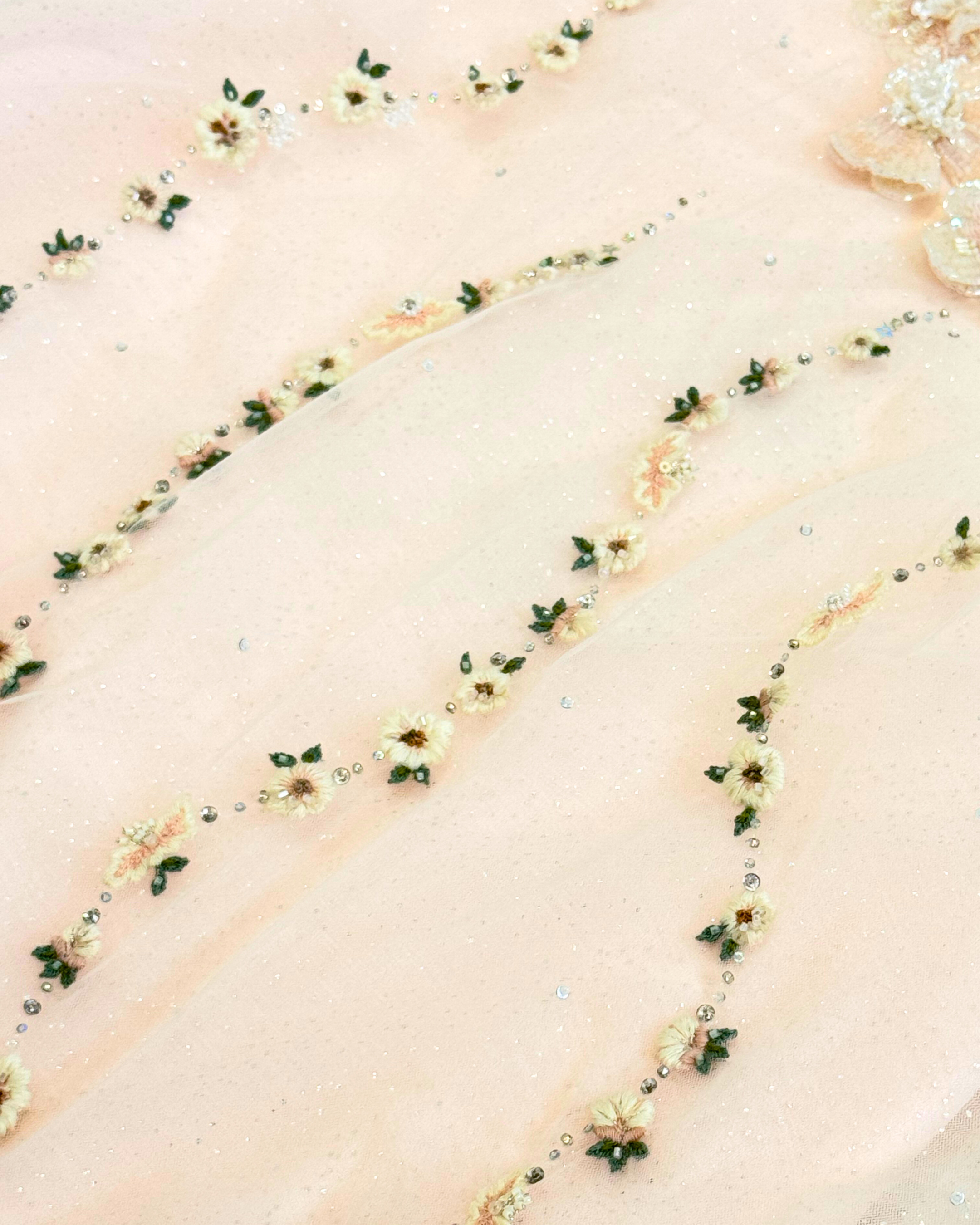 Artisanal Neckline: Hand-stitched 3D floral appliqués accented with premium crystals.